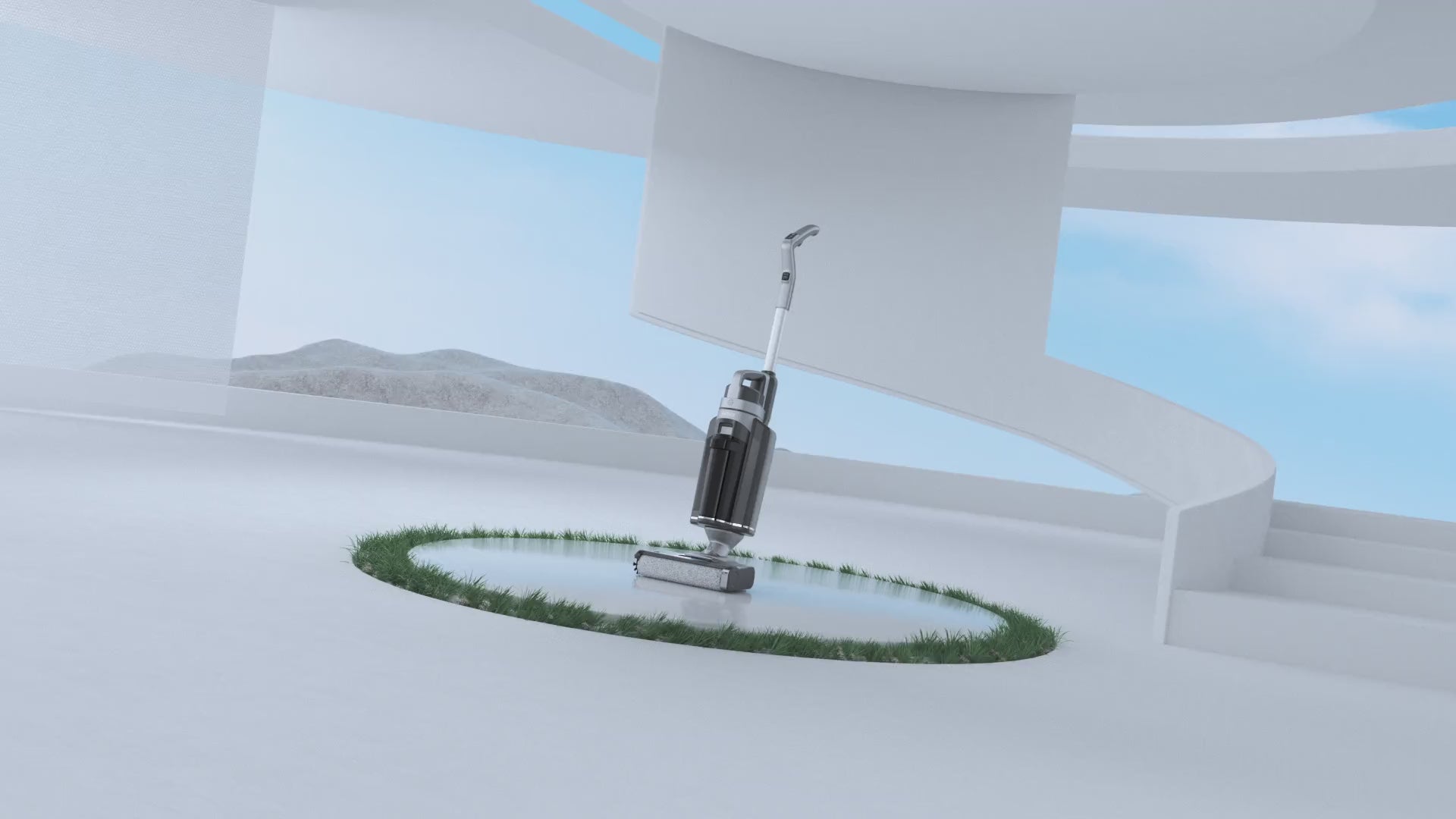 - Flat window cleaner vacuums, mops, and wipes glass and car windshields.